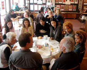 Her hosting of conversations started about six years ago and has evolved into what it is today. A round "Conversation Table" is always prominent up front in the café and people are encouraged to invite strangers from other tables or somebody they met the previous day to join in the conversation. "We take "anybody God sends thru the door" They come from all over the world. Many times they come to stay in our Peace Bed & Breakfast and to experience our famed Haight Street , home to the Summer of Love in1967. We look for differences in culture, race, gender, age.