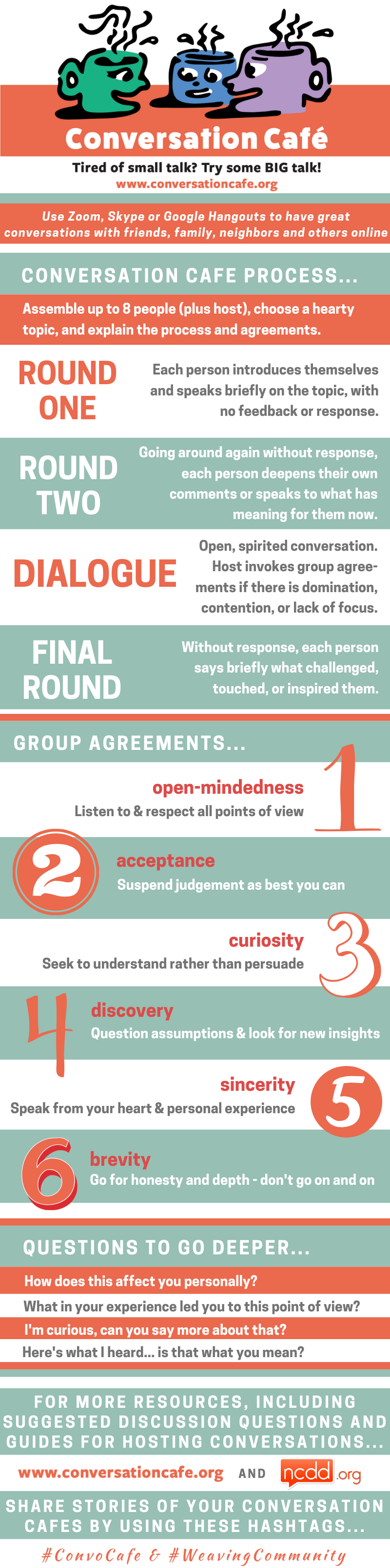 Hosting an online Conversation Cafe? If you are looking to open the event to others, please share it using this form for posting on the NCDD Events Calendar and the Conversation Cafe site.