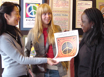 Sami notes that her greatest challenge is finding hosts for all the cities of the world. She also extends an invitation to new hosts to participate at the Red Vic and when they are ready, they can host their own World Conversations weekly at the Red Vic Peace Café. She has learned that between 4 to 9 people per table and a host at each table creates the best atmosphere for good conversation. But Sami states that the real key to her success is to just go up and invite people. "Lots of people are just waiting to be invited. I start by saying "Thanks for coming to our Peace Café" I say it to everyone, but especially if they are anyone who might feel uncertain of their welcome wherever they go.